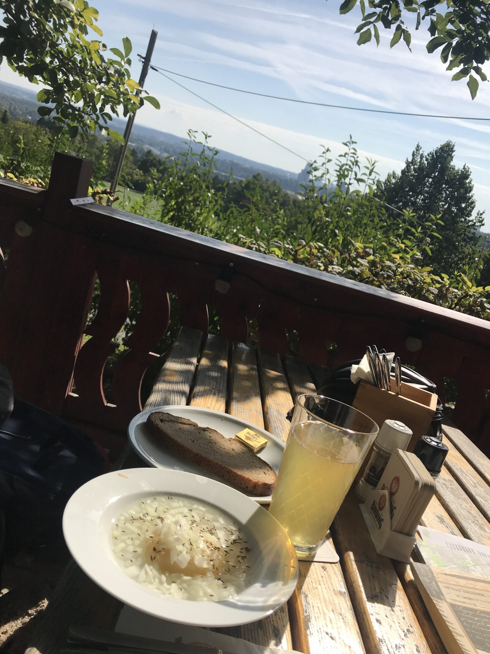 Angekommen am Lohrberger Hang, der kleinsten und östlichsten Einzellage des Rheingaus, kehren wir ein in der Lohrbergschänke. Dort erwartet uns eine gesetzte Weinprobe mit fünf Rieslingen aus der Region begleitet mit Wasser, Brot und einem Degustationsteller nach Frankfurter Art.
